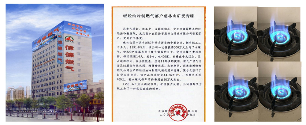 輕烴冷制燃?xì)猓?993年前研究的也是加溫制氣,做了107戶供氣,輕烴加溫36度以上就產(chǎn)氣,天氣冷,每天多次排殘液、管道每天排3~5(水)桶凝液(輕烴),火勢(shì)不穩(wěn),也威脅安全,準(zhǔn)備放棄改煤氣;國(guó)務(wù)院要求發(fā)展油制氣,研究不加溫試試,根據(jù)汽車用水降溫,摩托車用風(fēng)降溫不拉缸原理啟示,不兌任何添加劑,將輕烴完全汽化,解決了殘液、凝液?jiǎn)栴},專門(mén)改裝了1梯6戶,室外明管不保溫,在零下23度沒(méi)有凝液,經(jīng)完善達(dá)到了供氣穩(wěn)定的目的,承建了多個(gè)小區(qū),常溫低壓供氣,使用穩(wěn)定,找不到任何缺點(diǎn);于2003~2005年八次向黨中央,國(guó)務(wù)院、有關(guān)部委報(bào)《喜報(bào)》:得到了大力支持,定為《國(guó)家鼓勵(lì)發(fā)展的資源節(jié)約綜合利用和環(huán)境保護(hù)技術(shù)項(xiàng)目》、《免稅項(xiàng)目》和《城市燃?xì)狻贰?/span>